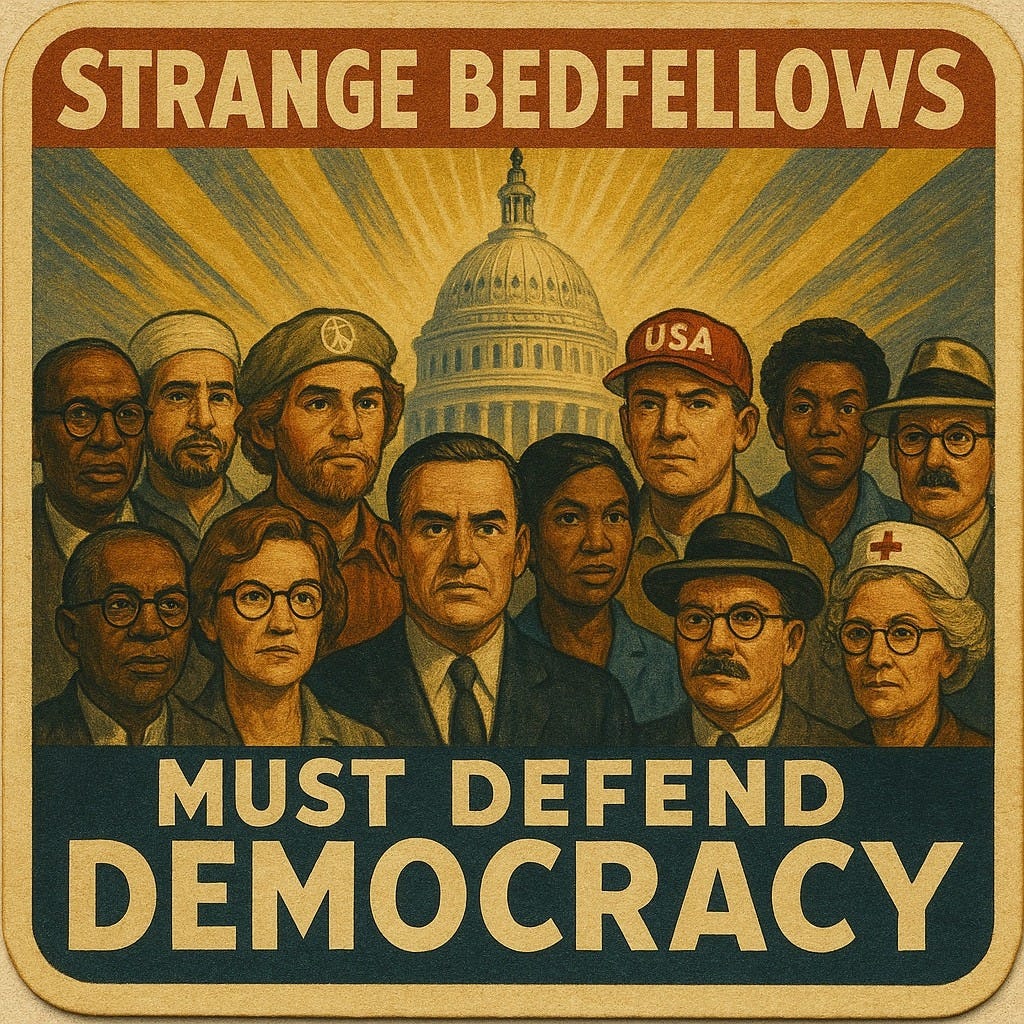 The Steady State often speaks of the need for what we have come to call “Strange Bedfellows.” The phrase is intentionally plainspoken. It describes a simple but powerful idea: that the preservation of democratic institutions depends on coalitions that cut across policy preferences, demographics, geography, profession, culture, and even long-standing political disagreements. In ordinary times, many of these alliances would feel unnatural. In some cases, they would not exist at all. But history, and the lived experience of our members, shows that when democratic systems come under sustained pressure, such coalitions are not merely useful. They are essential.